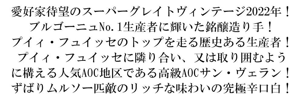 アシェット・ガイド誌2024年版でも18/20点を付けるスーパーグレイトヴィンテージ)でついに入荷!「マコン地域で最良の白!濃密な力強いもの。その最良のワイン」と言われるプイィ・フュイッセに隣り合い、又は取り囲むように構える人気AOC地区であるAOCサン・ヴェラン!