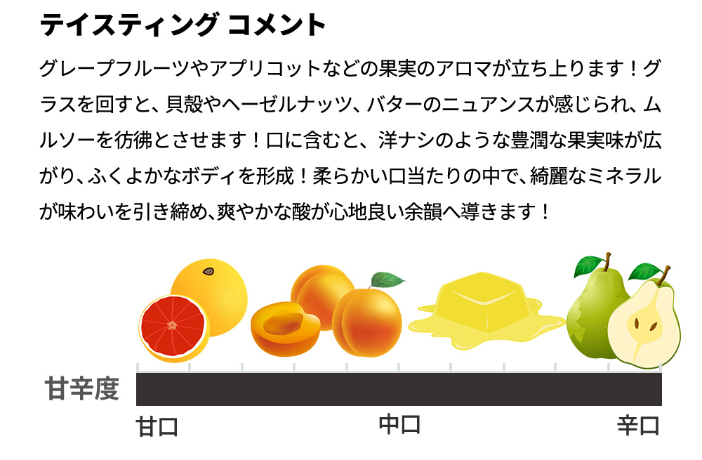 グレープフルーツやアプリコットなどの果実のアロマが立ち上ります!グラスを回すと、貝殻やヘーゼルナッツ、バターのニュアンスが感じられ、ムルソーを彷彿とさせます!