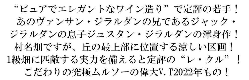 入手困難!銘醸ブルゴーニュ高級辛口白ワイン愛好家大注目!高級ムルソー愛好家大注目!リッチなテクスチャーで世界的に有名な白ワインの産地であり、高級白ワインのひとつ!コート・ドールの代表格でもあるムルソー!ブルゴーニュ最上の白ワインを産する村の中でも、もっともやわらかく芳醇で円熟している。ジャスパー・モリスM.W.は、「昔からムルソーの香りを“バターとヘーゼルナッツ(beurre et noisettes)”と表現し、フランスのソムリエ界でよく使う。(この2語は)セットになっており、片方の香りがわかるともう一方は自動的に見つかる。」と大注目するムルソー!しかも貴重なドメーヌものの高級ムルソー!しかも村名畑ですが、丘の最上部に位置する涼しい区画!一級畑に匹敵する実力を備えていると定評の“レ・クル”(「レ・クルス」は、ムルソー村のすぐ上にあるレ・ヴィルイユ、レ・カス・テット、レ・ティレの間に位置する地域です。レ・クルーのクリマは、ナルヴォーとティレットの延長線上にあり、丘の中腹の2番目の部分で村を支配しています。パノラマは素晴らしく、このロケーションがワインにある種のミネラルを与えています。左側のサン・クリストフに登ると見つけることができます。)!この区画では、吹き付ける風が強く、ブドウはゆっくりと生育するため、果皮の厚い遅摘みのブドウとなります!しかも斜面の畑らしく、ピュアで透明感のある引き締まった味わいが楽しめます!造り手はジャスパー・モリスMWが注目する次世代の若手生産者“ピュアでエレガントなワイン造り”で定評のジュスタン・ジラルダン(ジャスティン・ジラルダン)!「自然を尊重したワイン造り」「自然の酸と太陽を感じるワイン造りを目指す」あのヴァンサン・ジラルダンの兄であるジャック・ジラルダン家(同じくサントネ村本拠地)の息子!1990年生まれの若手生産者ジャスティン・ジラルダンによる平均樹齢は50年のヴィエイユ・ヴィーニュの古木のシャルドネ100%(「レ・クルー」に使用する葡萄の仕立てはギヨー)、収量は40hl/haです!手摘みで収穫した葡萄はステンレスタンクに入れ、アロマを保つために低温で発酵させます!発酵が始まったらフレンチオークの樽(新樽比率25%)に移します!澱と共に15ヶ月熟成させます!清澄し、軽くフィルターをかけてからボトリングします!しかも人気のグレイトヴィンテージ[2022]年もの!白い花やレモン、洋梨のアロマに加え、バターや焼いたヘーゼルナッツの要素が混ざっています!斜面の畑らしく、ぴりっと引き締まり、ピュアな透明感が感じられます!もちろん正規品の素晴らしい状態で限定少量入荷!