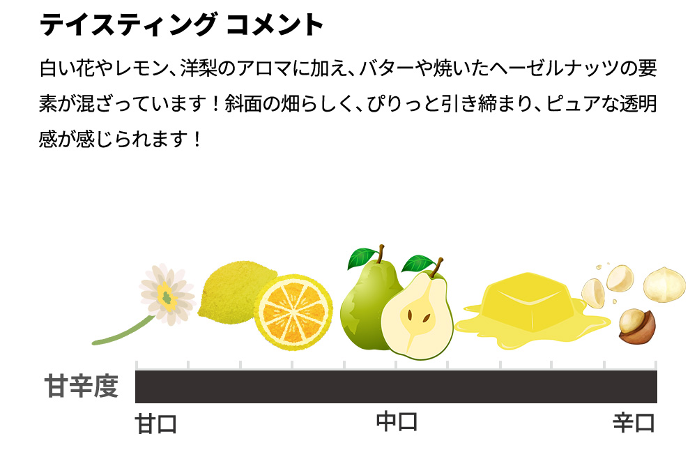 しかも人気のグレイトヴィンテージ[2022]年もの!白い花やレモン、洋梨のアロマに加え、バターや焼いたヘーゼルナッツの要素が混ざっています!斜面の畑らしく、ぴりっと引き締まり、ピュアな透明感が感じられます!