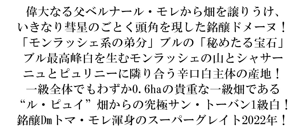 モンラッシェとシャサーニュ・モンラッシェに隣り合う「秘めたる宝石」究極一級辛口白ワインが大人気スーパーグレイトヴィンテージ[2022]年で、現地のセラー数ヶ月前の蔵出し品で限定少量入荷!