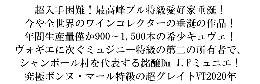 1863年創業の大人気ドメーヌ!ジャック・フレデリック・ミュニエの最高級ボンヌ・マール・グラン・クリュ!シャンボール・ミュジニー村とモレ・サン・ドゥニ村にまたがる15haの大人気グラン・クリュ!ヒュー・ジョンソン氏に「極めて頑強で寿命の長いワインは、ミュジニー特級ほどのかぐわしさはないが、シャンベルタンとも対等に勝負しうる」と高評価!のボンヌ・マール特級!