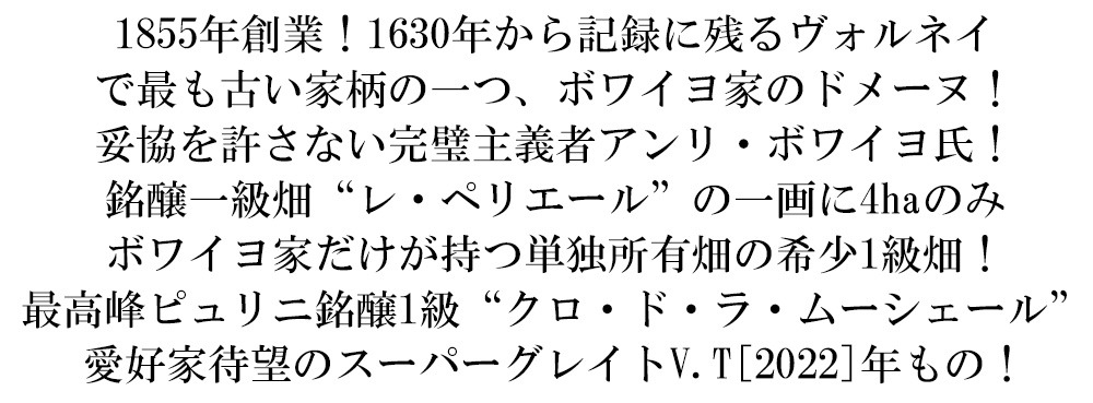 樹齢80年超えの古樹のブドウから生まれるワインは、この上なくピュアでエレガントな果実味とスパイスなどの複雑味、ほのかな心地良い樽香が混じり合い、凝縮感と深み、シャープな切れ味を持つ見事な逸品!ちなみに、ムーシェールはブルゴーニュの古語でハチを意味する!濃厚で強く、ミネラル感あふれる深い味わい!