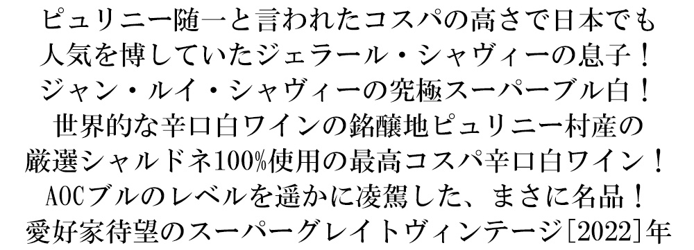 造り手は、ピュリニー随一と言われたコスパの高さで日本でも人気を博していたジェラール・シャヴィー!兄ジャン・ルイ・シャヴィーは、清涼感とフィネスに溢れていた父のワインのスタイルを受け継ぎつつ、ピュリニーならではの豊かなミネラル感や美しい酸といった要素をよりしっかりとワインに表現することを重視し、複雑で気品のある、ミネラルのうまみたっぷりのピュリニーを誕生!