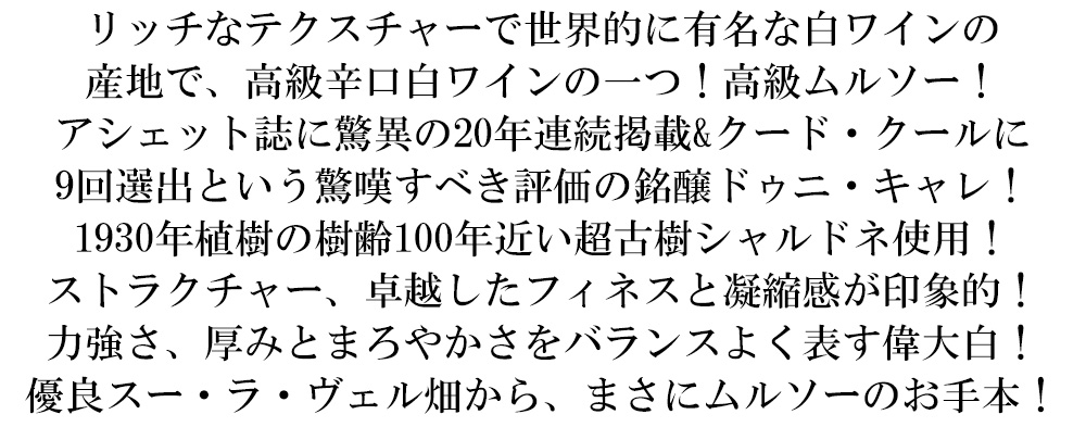 希少!高級ブルゴーニュ辛口白ワイン愛好家大注目!高級ムルソー愛好家大注目!リッチなテクスチャーで世界的に有名な白ワインの産地であり、高級白ワインのひとつ!コート・ドールの代表格でもあるムルソー!しかも貴重なモノポール畑(単一畑100%)のパーセルもの!ブルゴーニュ最上の白ワインを産する村の中でも、もっともやわらかく芳醇で円熟している。ジャスパー・モリスM.W.は、「昔からムルソーの香りを“バターとヘーゼルナッツ(beurre et noisettes)”と表現し、フランスのソムリエ界でよく使う。(この2語は)セットになっており、片方の香りがわかるともう一方は自動的に見つかる。」と大注目!するムルソー!しかも、わずか0.35haのスー・ラ・ヴェル区画の樹齢100年近い(1930年植樹の驚異のヴィエーユ・ヴィーニュ100%)古樹のシャルドネ100%!しかも素晴らしいヴィンテージで少量生産で有名な大人気のグレイトヴィンテージ[2021]年もの!しかも造り手はこれまでギド・アシェット誌に驚異の20年連続掲載&クード・クール(ハートに一撃)に9回選出という驚嘆すべき評価!しかもポマールやヴォルネイ村を見下ろすオート・コートのエリアに位置するムロワゼ村で1975年にドゥニ・キャレ夫妻が設立したドメーヌで、地元では毎年完売必至の人気を獲得するに至っています!2008年より2代目のガエタン(姉)とマルシアル(弟)がドメーヌを引き継いでいます!畑は12haを所有!2人は両親からの貴重な遺産を守るため、オーガニック栽培(自然派・ビオロジック(AB認定&ユーロリーフ認証))を導入しました!醸造所も非常に清潔で手入れが行き届いており、それはワインの味わいにもしっかり表れています!このムルソーのヴィエーユ・ヴィーニュ(リューディーのスー・ラ・ヴェル畑)の2021年は、1930年植樹の樹齢100年近い古木による低収量ブドウがもたらすストラクチャー、卓越したフィネスと凝縮感が印象的!力強さ、厚みとまろやかさをバランスよく表すまさにムルソーのお手本!畑:ムルソー村のスー・ラ・ヴェル区画!区画名は「村の下」を意味!標高230m!南東向き!粘土石灰質土壌!下層は水はけの良い砂利!栽培・収穫:1930年に植樹!収量が自然に抑えられる区画!オーガニック認証転換中の有機農法!手摘み収穫! 醸造・熟成:厳しい選果後、健全な実のみをゆっくりと発酵!天然酵母使用!樽にて16~20ヶ月の熟成で造られます!ドメーヌからのコメントは『1930年に植えられたこの区画はドメーヌで最も古い。ムルソー村の丘の中腹、「村の下 」を意味するリュー・ディ(Sous la Velle)にある。樹齢100年近いシャルドネの古木は、粘土質に植えられており、下層土は細かい砂利で水はけが非常に良い。低収量、ミルランダージュ、小房で、このムルソーは真の骨格を持ち、驚くべきフィネスと豊かさを持つ。力強さ、脂肪分、まろやかさのバランスが完璧で、このアペラシオンの特徴となっている。』と力のこもったコメント!最高級ムルソーVVが現地のセラー数ヶ月前の蔵出し正規品で限定少量入荷!