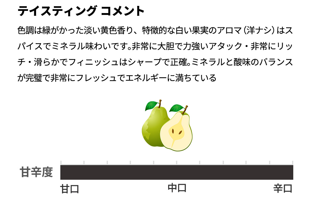 『アカシア、ライラック、柑橘類のコンフィのようなフローラルなアロマには、ほとんど感じられないが、木の香りが感じられる。生き生きとした非常になめらかな中量級の風味は、洗練された口当たりと素晴らしい凝縮感を持ち、石のように苦いレモンを思わせる、美しく持続性のあるフィニッシュで締めくくられる。グット・ドールのような大きさと重さはないが、より繊細である。93点』で大絶賛!