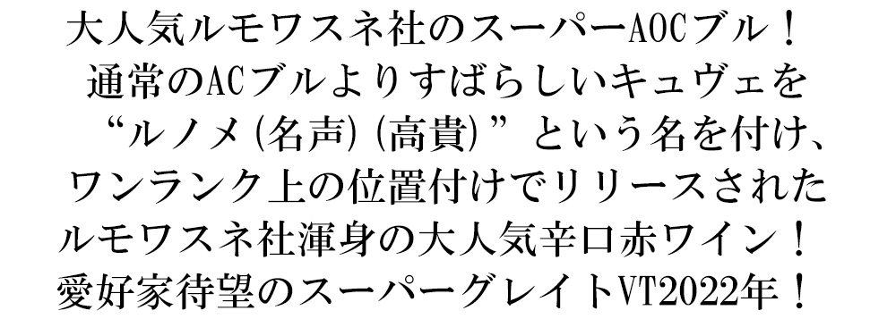 造り手は、1877年創立、偉大な地下カーヴに豊富な古酒在庫を持ち、飲み頃になった古酒を蔵出し状態で提供することで有名なルモワスネ社!しかも通常のAOCブルよりすばらしいキュヴェを“ルノメ(名声)”という名を付け、ワンランク上の位置付けでリリースされた人気辛口赤ワイン!