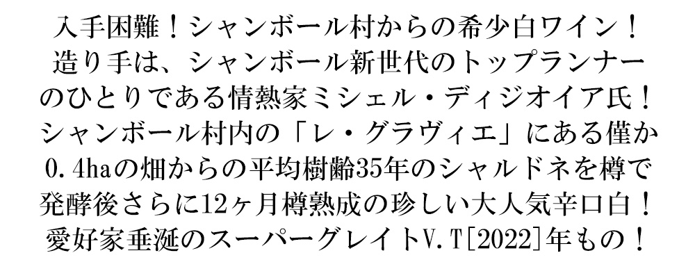 ギィド・アシェット誌をはじめジルベール&ガイヤール、レビュー・デュ・ヴァン・ド・フランス誌等も大注目のシャンボール新世代のトップランナーのひとりである情熱家ミシェル・ディジオイアの人気のAOCブルゴーニュ・シャルドネ!