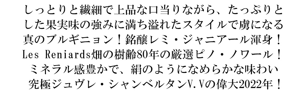 上品な口当たりながらしっかりとしたストラクチャーとミネラル感たっぷりの、果実味あふれるこのワインはジュヴレ・シャンベルタンのLes Reniards畑にわずか0.22ha!1945年植樹(約80年樹齢)のスーパーVV!「ミネラル感豊かで、絹のようになめらかなジュヴレを目指しています」と当主レミ・ジャニアール!もちろん現地のセラー数ヶ月前の蔵出し作品で限定で少量入荷!