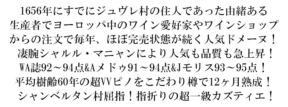 今、人気も品質もすごい凄腕アンリ・マニャンの究極ジュヴレ銘醸1級カズティエ!が偉大な大人気ヴィンテージ[2022]年で、しかも現地セラー数ヶ月前の蔵出し作品で限定で少量入荷!