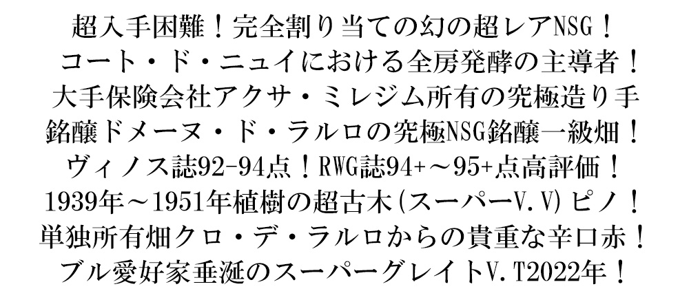 コメントは「2022年のニュイ・サン・ジョルジュ・クロ・ド・ラルロ・プルミエ・クリュも、香りが少し還元され、時とともにキイチゴの赤いベリー類や野生の生垣、土壌の香りが漂ってきました。オークは40%が新樽で、きれいに溶け込んでいます。味わいはミディアムボディで、口に含むとブラックプラムとラズベリーの果実味がたっぷりです。糖分が多く、グリップは穏やかで、オールスパイスの香りがほのかに漂い、フィニッシュに向かってリコリスの香りもほんのりと感じられます。現時点ではかなりずんぐりとしたクロ・ド・ラルロですが、バランスが非常に良いので、3年から5年は瓶熟しておくとよいでしょう。」