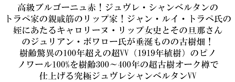 ずばりブロション村内の区画「メ・バ」からの僅か0.5haの畑から、樹齢約100年の超VV(1919年植樹)ピノ100%を収量35hl/ha!ステンレスタンクでアルコール発酵後、自家製樽でマロラクティック発酵&12ヶ月間熟成(新樽比率35%)清澄は行わず、軽くフィルターをかけてビン詰めされるドメーヌ・リップ・ボワローによる超こだわり究極ジュヴレ・シャンベルタンが記念すべき5回目のスーパーグレイトヴィンテージの[2022]年で現地のセラー数ヶ月前の蔵出し作品で限定少量入荷!