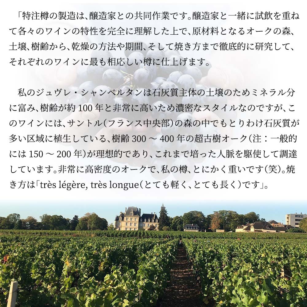 高級ブルゴーニュ辛口赤ワイン愛好家大注目!強いストラクチャーと優雅さを併せ持つブルゴーニュ赤ワインの王様!ジュヴレ・シャンベルタン!愛好家待望のスーパーグレートヴィンテージと言われる[2022]年もの(ブルゴーニュの赤にアシェットガイド誌2025年版18/20点&RVF誌2025年版98点)がついに入荷!しかも造り手は、ブロション村に1620年より続くぶどう栽培家の家系で、ジュヴレ・シャンベルタンのトラペ家の親戚筋に当たるリップ家!数世紀もの長きにわたって、「ルイ・ラトゥール」や「ブシャール・ペール・エ・フィス」といったネゴシアンにぶどうを販売してきましたが、2017年、ジャン・ルイ・トラペ氏の姪にあたるキャロリーヌ・リップ女史とその旦那さんのジュリアン・ボワロー氏が垂涎ものの古樹畑を継承したのを機に、自社ビン詰めをスタート!ジュリアン・ボワローは、ダミー社、ビヨン社、レモン社といったブルゴーニュの名門樽メーカーでキャリアを積み重ねてきた樽職人で、最後はマルサネ社の樽製造責任者として、「ブルーノ・クレール」「フランソワ・ラマルシュ」「ルー・デュモン」等々の生産者に特注の樽を納めました!醸造家の道を歩む決心をしたジュリアンは、「DRC(ドメーヌ・ド・ラ・ロマネ・コンティ)」の前醸造長ベルナール・ノブレに学んだエドゥアルド・パパン率いる、同じ村の「ドメーヌ・クリュニー」で1年間修行した後、2018年に新ドメーヌ「リップ・ボワロー」を設立し、自社ビン詰めを開始!樽はもちろん自作で、「特注樽の製造は、醸造家との共同作業です。醸造家と一緒に試飲を重ねて各々のワインの特性を完全に理解した上で、原材料となるオークの森、土壌、樹齢から、乾燥の方法や期間、そして焼き方まで徹底的に研究して、それぞれのワインに最も相応しい樽に仕上げます。私のジュヴレ・シャンベルタンは石灰質主体の土壌のためミネラル分に富み、樹齢が約100年と非常に高いため濃密なスタイルなのですが、このワインには、サントル(フランス中央部)の森の中でもとりわけ石灰質が多い区域に植生している、樹齢300~400年の超古樹オーク(注:一般的には150~200年)が理想的であり、これまで培った人脈を駆使して調達しています。非常に高密度のオークで、私の樽、とにかく重いです(笑)。焼き方は「tres legere, tres longue(とても軽く、とても長く)です」。「ワインを樽で熟成させる目的は、樽の(木の)香りをワインにつけるためではありません。むしろ逆に、樽で熟成させたことを感じさせないことこそが極意です。ではそもそも樽に入れなければいいのかというと、そうではないところがワインの奥深いところです。樽熟成の作用については非常に技術的な話になるので別の機会に譲りますが、私は「ワインに魔法がかかる」と表現しています」。ずばりブロション村内の区画「メ・バ」からの僅か0.5haの畑から、樹齢約100年の超VV(1919年植樹)ピノ100%を収量35hl/ha!ステンレスタンクでアルコール発酵後、自家製樽でマロラクティック発酵&12ヶ月間熟成(新樽比率35%)清澄は行わず、軽くフィルターをかけてビン詰めされるドメーヌ・リップ・ボワローによる超こだわり究極ジュヴレ・シャンベルタンが記念すべき5回目のスーパーグレイトヴィンテージの[2022]年で現地のセラー数ヶ月前の蔵出し作品で限定少量入荷!