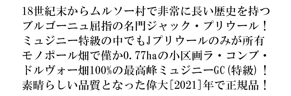 ワイン評論家のマット・クレイマー氏に「ミュジニーこそは究極のシャンボール・ミュジニーであり、ひびきの強い味わいに格調の高さがあいまって無上のとりあわせをみせる」と大絶賛させた究極ミュジニーグラン・クリュ・特級!