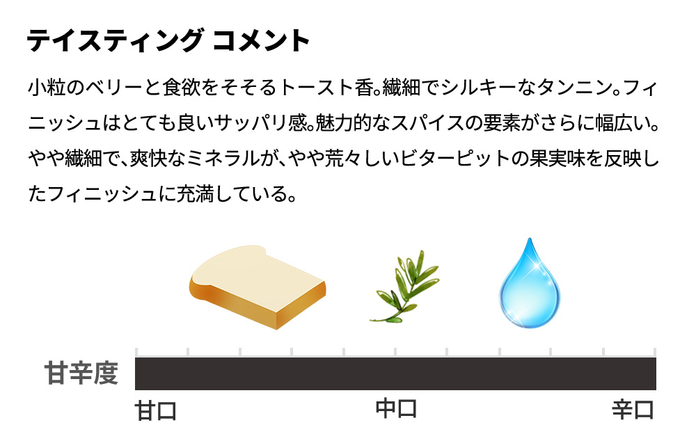『魅力的なスパイスの要素がさらに幅広い。やや繊細で、爽快なミネラルが、やや荒々しいビターピットの果実味を反映したフィニッシュに充満している。91~94点』