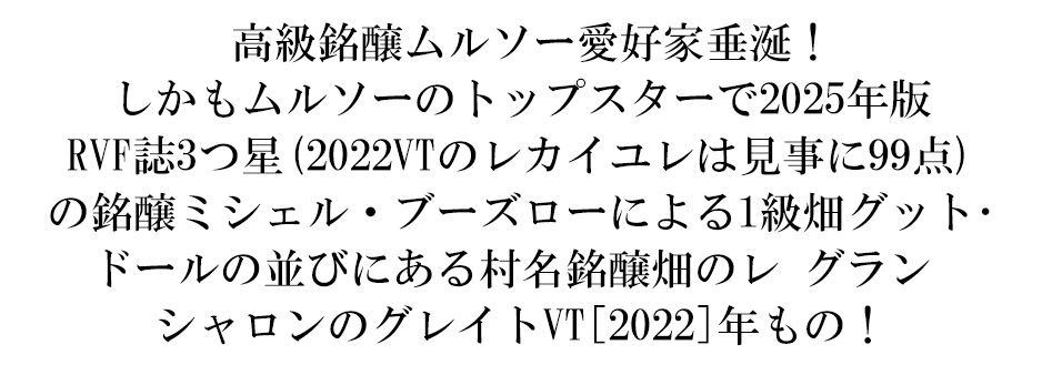 ムルソーのトップスターで2025年版RVF誌3つ星(2022VT掲載6作品すべてが91点以上レカイユレは見事に99点)のミシェル・ブーズローによるブルゴーニュ三大辛口白ワインのひとつ!しかもスーパーグレイトヴィンテージ2022年もの!
