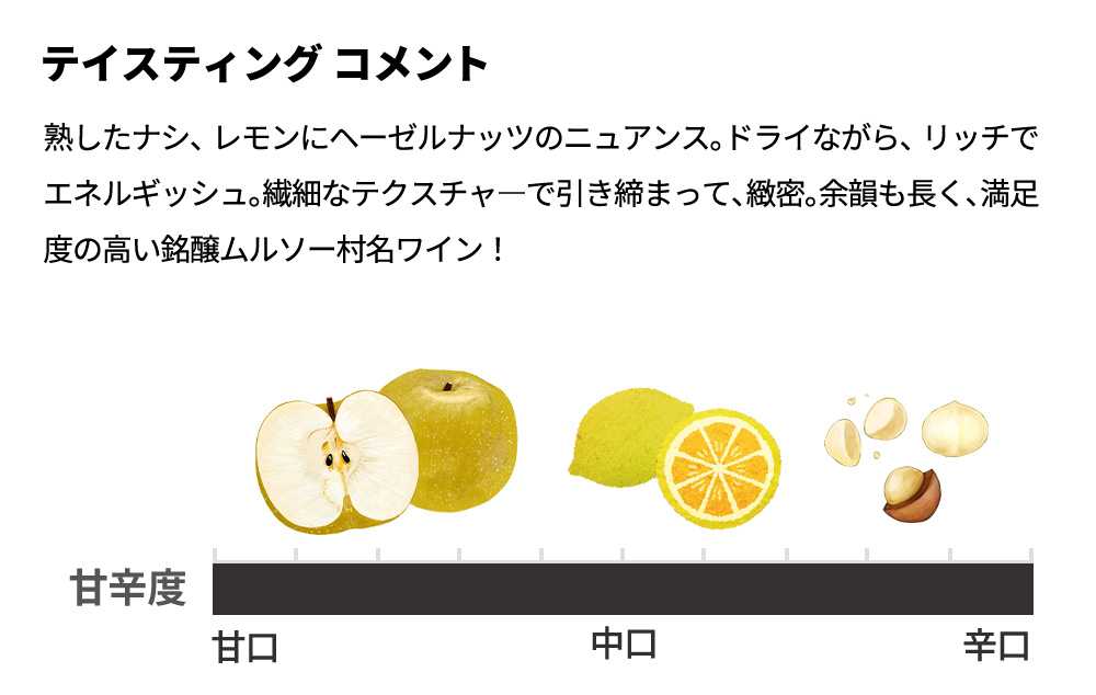 熟したナシ、レモンにヘーゼルナッツのニュアンス。ドライながら、リッチでエネルギッシュ。繊細なテクスチャーで引き締まって、緻密。余韻も長く、満足度の高い銘醸ムルソー村名ワインが限定少量入荷!