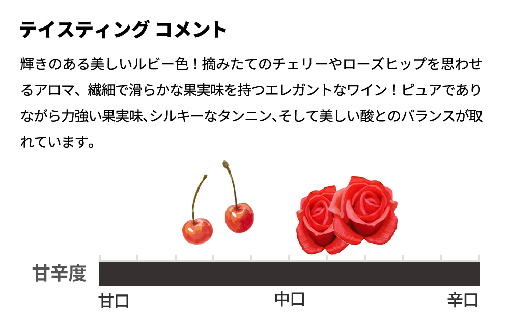 輝きのある美しいルビー色!摘みたてのチェリーやローズヒップを思わせるアロマ、繊細で滑らかな果実味を持つエレガントなワイン!
