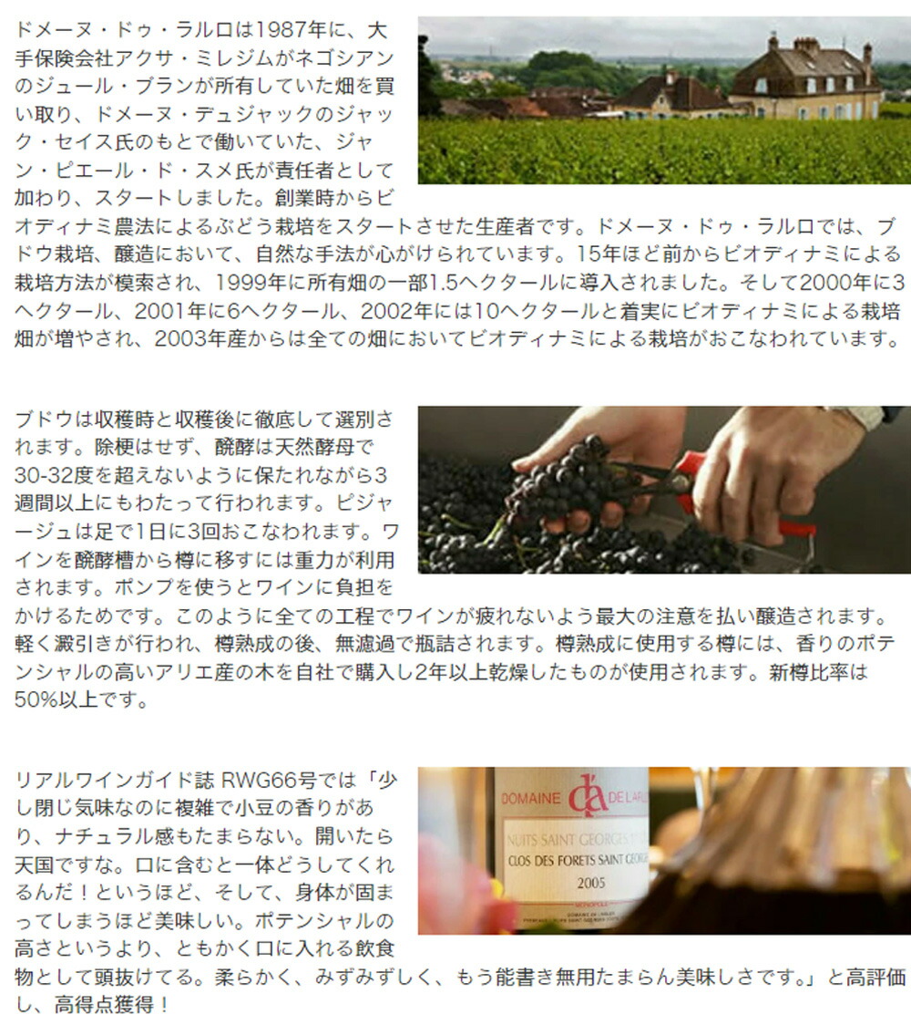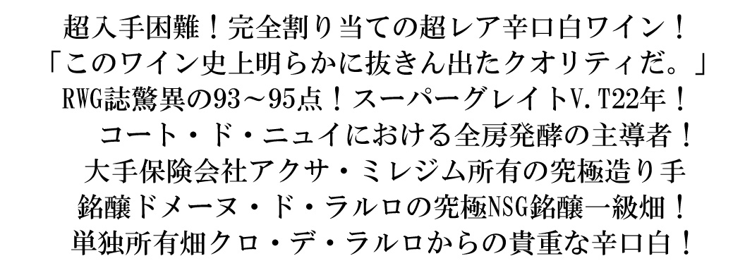 「複雑で奥深いフルーツ香にクリーミーな樽の要素が混じり合い、ちょっと香水のようなメチャいい香り。これは少しビックリもんだ。口に含むと少し発展途上さを感じる液体。もちろんパッと見は完成されたような美味しさなんだけど、全体の映像がまだクッキリとしていない。ミネラル感もまだ半分ほどしか表現されていない。それでもこの驚くほどの複雑な味わい。このワイン史上明らかに抜きん出たクオリティだ。3年以上寝かせてから。夢のようなクロ・ド・ラルロ・ブラン。」とコメント