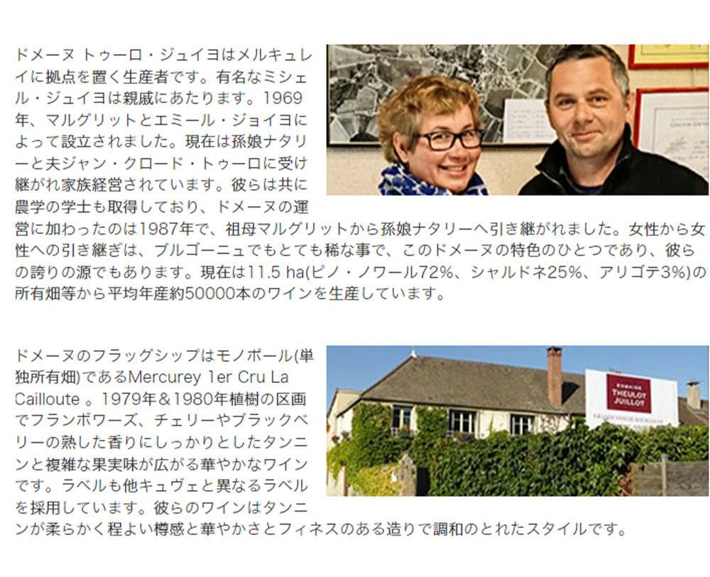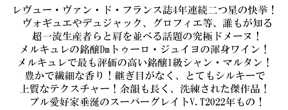 レヴュー・ヴァン・ド・フランス誌2021~2024年まで二つ星の快挙(同じ二つ星評価にはコント・ジョルジュ・ド・ヴォギュエやデュジャック、ロベール・グロフィエ等、誰もが知る超一流生産者らと肩を並べています。)ずばりメルキュレ本拠地で今、現地ブルゴーニュでも話題のドメーヌ・トゥーロ・ジュイヨの究極メルキュレ!しかもメルキュレで最も評価の高い銘醸一級畑“シャン・マルタン”!