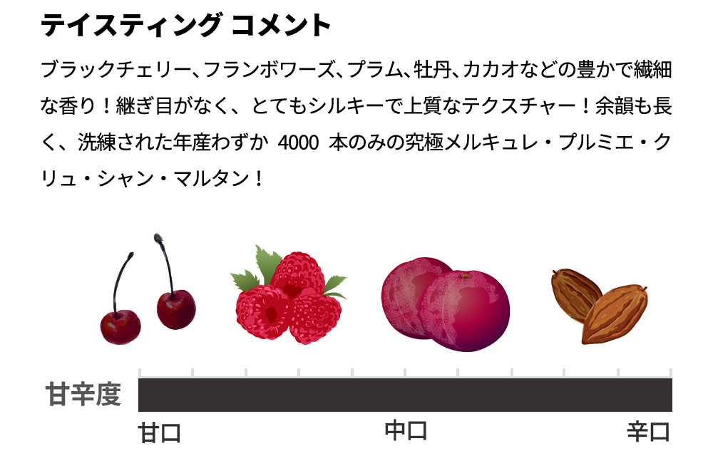 ブラックチェリー、フランボワーズ、プラム、牡丹、カカオなどの豊かで繊細な香り!継ぎ目がなく、とてもシルキーで上質なテクスチャー!余韻も長く、洗練された年産わずか4000本のみの究極メルキュレ・プルミエ・クリュ・シャン・マルタン!