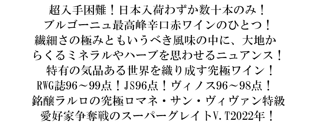 日本市場数十本のみ入荷の究極ロマネ・サン・ヴィヴァン特級の大人気スーパーグレイトヴィンテージ[2022]年が限定で正規品で極少量入荷!