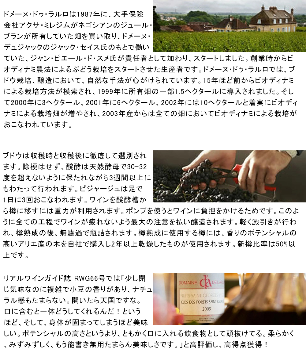 ジェームス・サックリング驚異の96点でコメントは「この美しいロマネ・サン・ヴィヴァンのブーケは、赤い果実と夏の花の雲のようだ。口に含むと、素晴らしいビロードのような味わいが広がり、しっかりとした骨格に包まれる。非常に長いフィニッシュで、繊細なタンニンがこの偉大なテクスチャーの複雑性を与えている。バイオダイナミック農法で栽培されたブドウを使用。」
