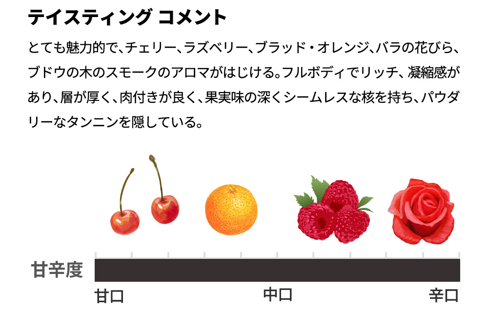 『アロマは1erとよく似ているが、より控えめで、ニュアンスを引き出すにはスワリングが必要である。口に含むと、豊富な樹液のおかげで、大きさ、重さ、中盤の密度が明らかに増しており、非常に魅惑的な口当たりをもたらすと同時に、非常に長く、若々しく渋く、明らかに力強いフィニッシュを形作るタンニンの構造を緩衝している。