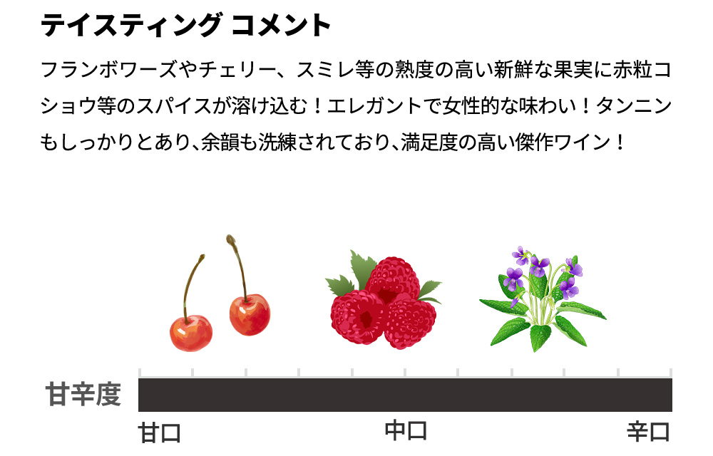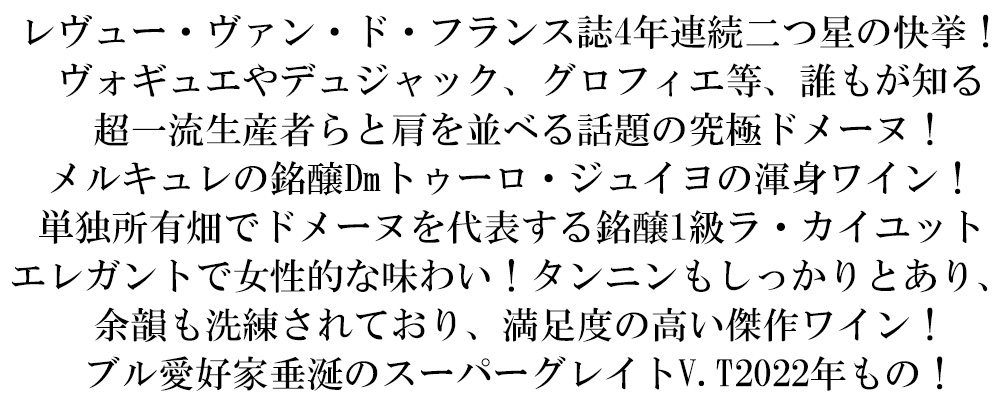 フランボワーズやチェリー、スミレ等の熟度の高い新鮮な果実に赤粒コショウ等のスパイスが溶け込む!エレガントで女性的な味わい!タンニンもしっかりとあり、余韻も洗練されており、満足度の高い傑作ワイン!コント・ジョルジュ・ド・ヴォギュエやデュジャック、ロベール・グロフィエ等、誰もが知る超一流生産者らと肩を並べる今、話題のトゥーロ・ジュイヨの単独所有(モノポール)一級畑ラ・カイユットからの究極メルキュレ1級のスーパーグレイトヴィンテージ[2022]年ものが限定で少量入荷!