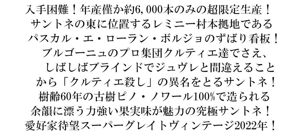 サントネファン大注目!年産僅か約6,000本のみ!しかも待望のスーパーグレートヴィンテージ[2022]年もので遂に少量入荷!