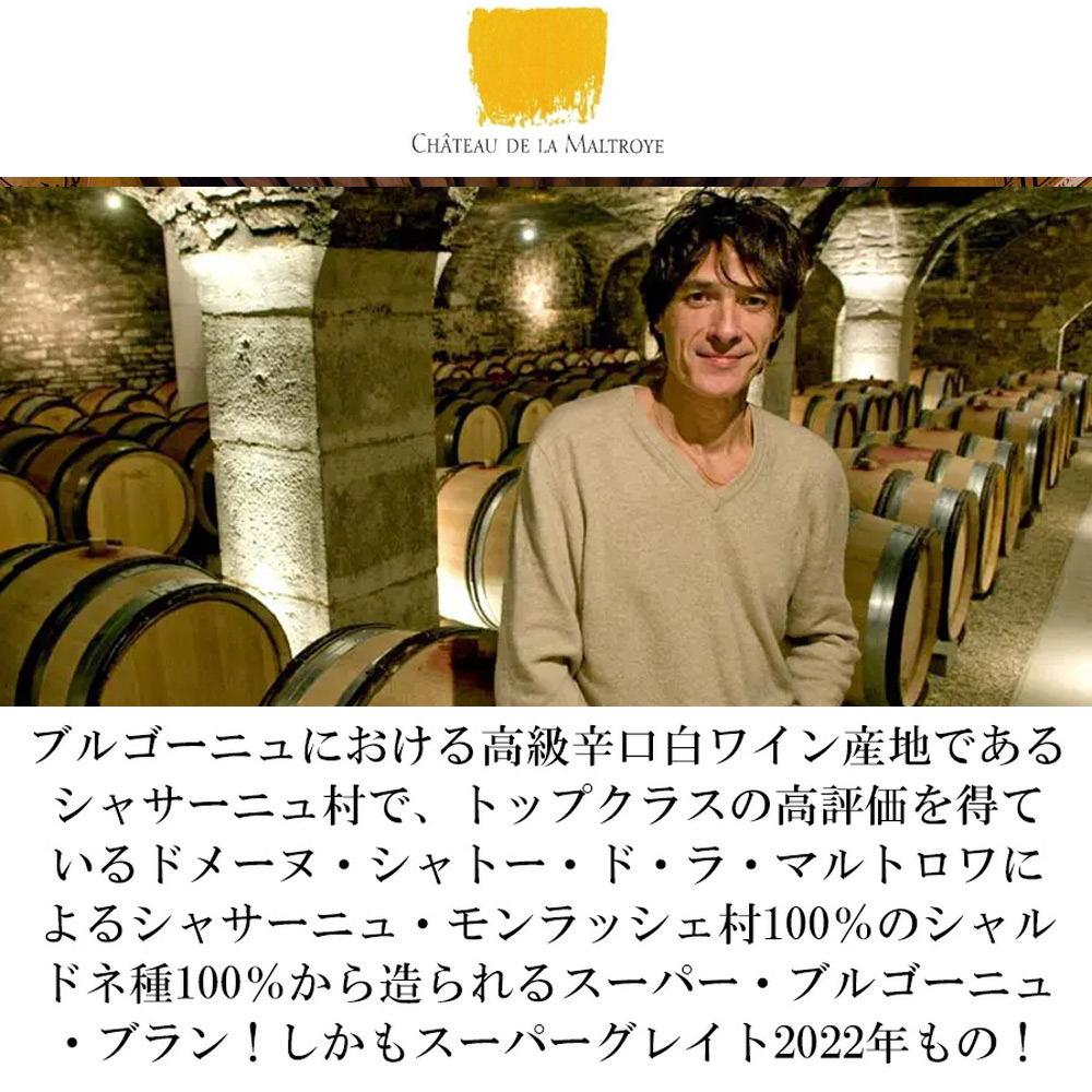 ブルゴーニュ辛口白ワイン愛好家大注目!ブルゴーニュにおける高級辛口白ワイン産地であるシャサーニュ村で、トップクラスの高評価を得ているドメーヌ・シャトー・ド・ラ・マルトロワによるシャサーニュ村の区画のシャルドネ種100%から造られるスーパー・ブルゴーニュ・ブラン!造り手は、シャサーニュ・モンラッシェ村を代表するドメーヌであり、中でもスター的存在!15世紀からの歴史を誇るシャトーを擁する有名ドメーヌによる大人気スーパーグレイトヴィンテージ[2022]年(ワインアドヴォケイト誌ではブルゴーニュの白に驚異の96点の最高評価)!しかもこのドメーヌのシンボルとも言えるシャサーニュ・モンラッシェのクロ・ド・シャトーの片鱗をも感じさせる究極AOCブルゴーニュ・シャルドネ!なんとこのACブル白が今やパーカーを凌駕する勢いのアラン・メドゥのバーガウンド・ドット・コムで“Outstanding Top Value”のコメント付きでハートマークで絶賛(2024年6月10日号)!過去のACブル白でも“Outstanding”評価連発!この2022年の絶賛コメントは『熟した、フレッシュで美しいノーズは、白桃、ペトロール、そしてエキゾチックな特徴の香りを自由に放ちます。しなやかだがしっかりと濃縮されたミディアムウェイトのフレーバーは、爽やかで密やかな長い余韻に十分な長さを持ち、ほのかな苦味がゆっくりと現れます。これはレベルの割に素晴らしいので、チェックしてみる価値があります。“Outstanding Top Value”87点』と大注目!「土地の性格、持ち味、を最大限強調する」をフィロソフィーとするシャトー・ド・マルトロワらしい味わいは、良く熟した果実味と高度にバランスのとれた味わいとして定評!トロピカルな果実のフレッシュでいきいきしたアロマにオーク樽由来のほにかにスパイス香が混じる、ずばり、このクラスとしては数ランク上の複雑味や厚味をもったリッチなスタイル!の究極ブルゴーニュ・シャルドネが限定で正規品で極少量入荷!良く熟した果実味と高度にバランスのとれた味わいをぜひご賞味下さい!サーヴ温度は6℃~12℃