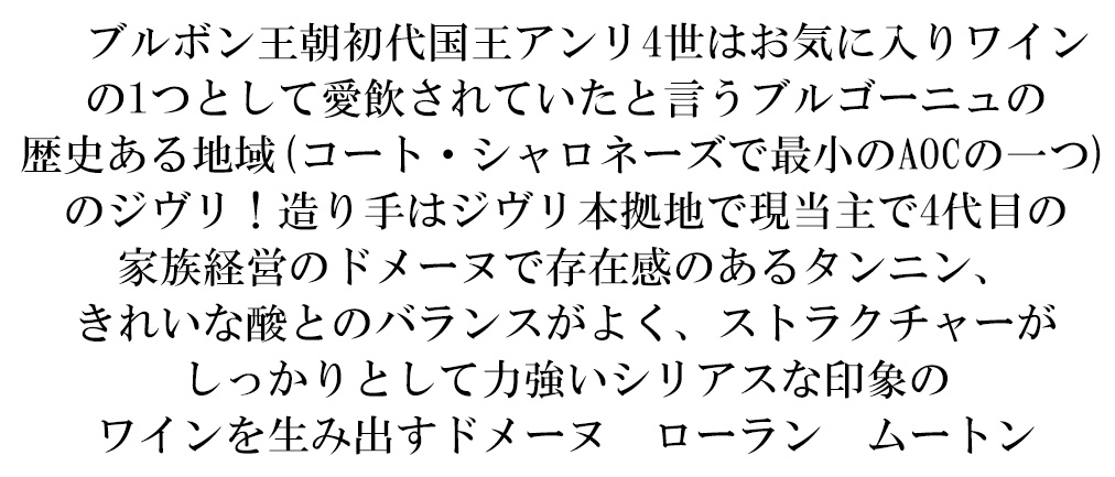 4代にわたりワイン生産に携わってきましたが、ドメーヌ元詰めを始めたのは1976年、先代のジェラールの時代から。2002年からローランがドメーヌに参画し、現在ではドメーヌの中心を担っています。ジヴリ村名、1級とレジョナルの畑を12ha所有。赤は果実味と存在感のあるタンニン、きれいな酸とのバランスがよく、ストラクチャーがしっかりとして力強いシリアスな印象のワインを生み出しています。ローランの時代になってから評価が高まり、ジヴリを代表する生産者の1人となっています。