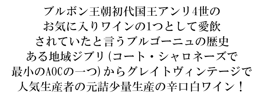 生産量が少なく入手しづらいAOCジブリの白!アカシアの花の芳香と新鮮でデリケートな風味で有名なブルゴーニュ辛口白ワイン!