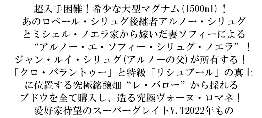 高級ブルゴーニュ辛口赤ワイン愛好家感涙!ヴォーヌ・ロマネ愛好家垂涎!しかも貴重な大型マグナムサイズ(1500ml)!しかも大人気スーパーグレイトヴィンテージ[2022]年もの!