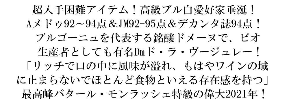「リッチで口の中に風味が溢れ、もはやワインの域に止まらないでほとんど食物といえる存在感を持つ」と言わしめたモンラッシェ特級に隣接する究極バタール・モンラッシェ!ミネラル感に溢れ、バターや蜂蜜、ローストしたアーモンドの複雑でリッチな風味!骨格とミネラル、そしてまろやかさが見事に調和した究極高級辛口白ワイン!最高峰バタール・モンラッシェ特級がグレイトヴィンテージ[2021]年で限定で少量入荷!