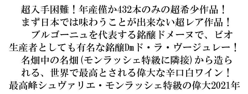 ブルゴーニュ高級辛口白ワイン愛好家感涙!年産僅か432本のみの超希少作品!偉大なブルゴーニュの最高辛口特級白ワインのひとつ!ミネラリーなワインを産出する、世界的な白の銘醸地!今やモンラッシェ特級よりも入手することが難しい最高峰シュヴァリエ・モンラッシェ・グラン・クリュ(特級)が極少量入荷!