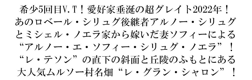 超入手困難!完全割当て品!高級ムルソー愛好家垂涎!ブルゴーニュ高級辛口白ワイン愛好家大注目!年間一樽のみの超限定生産品!しかもこの偉大なブルゴーニュの大人気辛口白ワインが大人気スーパーグレイトヴィンテージ[2022]年!(ブルゴーニュ委員会による評価は『ワインは良質で、凝縮感とバランスに優れている。極端な暑さに見舞われた年であったというのに、新鮮な果実のアロマと躍動感が明るい未来を感じさせる、驚くべきヴィンテージとなった。白ワインは、その丸み、滑らかさ、そして複雑さで際立っている。リッチで非常に表情豊か、果実のアロマが過度にならずに存在感を示している。味わいでは、みずみずしい果実味とバランスの良さが生き生きと持続する。』と大絶賛!アシェット・ガイド誌2024年版でも18/20点を付けるスーパーグレイトヴィンテージ)でついに入荷!リッチなテクスチャーで世界的に有名な白ワインの産地であり、高級白ワインのひとつ!コート・ドールの代表格でもあるムルソー!ブルゴーニュ最上の白ワインを産する村の中でも、もっともやわらかく芳醇で円熟している。ジャスパー・モリスM.W.は、「昔からムルソーの香りを“バターとヘーゼルナッツ(beurre et noisettes)”と表現し、フランスのソムリエ界でよく使う。(この2語は)セットになっており、片方の香りがわかるともう一方は自動的に見つかる。」と大注目!するムルソー!造り手はあのブルゴーニュ最高峰!ロマネ・コンティを擁するブルゴーニュで最も偉大な葡萄畑をもつ村ヴォーヌ・ロマネ村の銘醸造り手ロベール・シリュグの後継者アルノー・シリュグとミシェル・ノエラ家から嫁いだ妻ソフィーによる“アルノー・エ・ソフィー・シリュグ・ノエラ”!アルノー・エ・ソフィーのワインはテロワールの特徴を表現したいため、人的介入をできるだけ少なくしている!彼らが表現したいのは「フィネス、エレガンス、テロワールと果実味!」ソフィーとアルノーはワインに求めるスタイルという点で互いに完全に一致しており、ビジョンとフィロソフィーをワインに表現できるように日々努めています。ずばりアルノー・エ・ソフィー・シリュグ・ノエラによるこの2021年が記念すべき4回目ヴィンテージの究極ムルソー・レ・グラン・シャロン!しかも畑は“レ・テソン”の直下の斜面と丘陵のふもとにある人気村名畑の“レ・グラン・シャロン”!高いポテンシャルが魅力的!アーモンドやバター、ナッツやヴァニラ等の香ばしい香りと白い花やシトラス等の果実、ピュアなエキスに程よい樽感とミネラル感のあるシャープな味わいと、伸びのある酸が秀逸な特徴の究極ムルソー大人気畑が、スーパーグレイトヴィンテージ[2022]年で、限定で、しかも蔵出しの素晴らしい状態で極少量入荷!