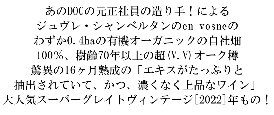 ロマネ・コンティの元正社員の造り手!による、あのDOC(ドメーヌ・ド・ラ・ロマネ・コンティ)の雰囲気を感じられると噂の究極ジュヴレ・シャンベルタン!