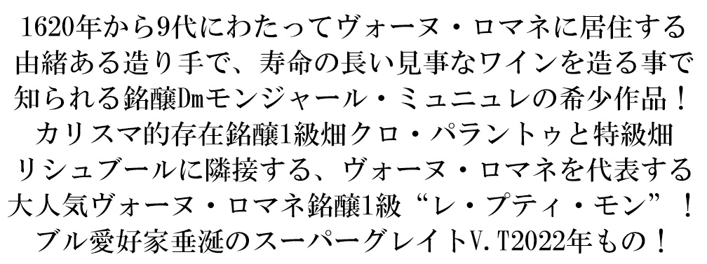 ドメーヌ・モンジャール・ミュニュレの究極ヴォーヌ・ロマネ銘醸一級レ・プティ・モンが大人気スーパーグレイトヴィンテージ[2022]年もので完全割り当てで限定少量入荷!