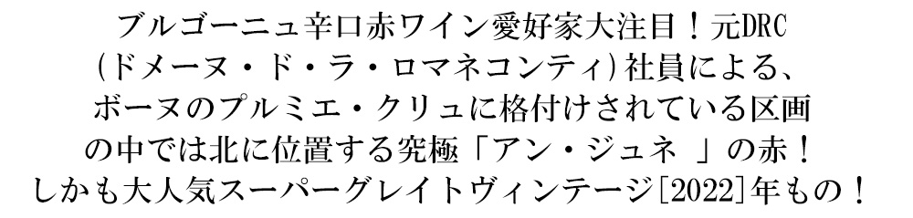 元DRC(ドメーヌ・ド・ラ・ロマネコンティ)社員による、あのDOC(ドメーヌ・ド・ラ・ロマネ・コンティ)の雰囲気を感じられると噂の究極ボーヌ プルミエ・クリュ アン・ジュネ!