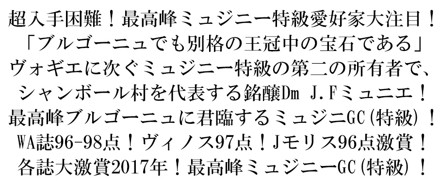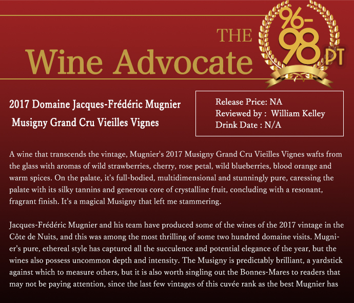 ワインアドヴォケイト誌驚異の96-98点!コメントは「ヴィンテージを超越したワイン、ミュニエの2017ミュジニー・グラン・クリュ・ヴィエイユ・ヴィーニュは、野イチゴ、チェリー、バラの花びら、野生のブルーベリー、ブラッドオレンジ、温かみのあるスパイスのアロマがグラスから漂う。口に含むと、フルボディで多次元的、そして驚くほどピュアで、絹のようなタンニンとクリスタルのような果実味のたっぷりとした核で口中を愛撫し、共鳴的で香り高いフィニッシュで締めくくる。魔法のようなミュジニーで、思わず口ごもった。」!