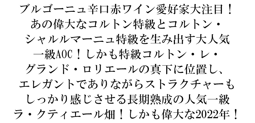 究極アロース・コルトン・プルミエ・クリュ・一級・ラ・クーティエール!待望のスーパーグレイトヴィンテージ[2022]年で、しかも現地のセラー数ヶ月前の蔵出し作品で限定で少量入荷!
