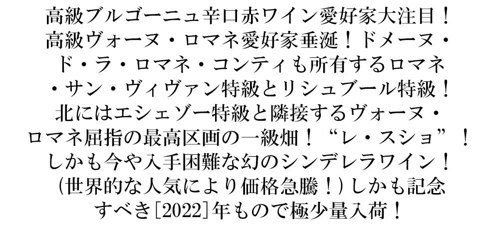 このヴォーヌ・ロマネ・一級レスショは、わずか0.68haの畑からの平均樹齢驚異の40~60年のVVのピノ・ノワール100%!収量は35hl/ha!ステンレスタンクでアルコール発酵後、新樽率50%でマロラクティック発酵&18ヶ月間樽熟成で造られる究極ヴォーヌ・ロマネ・プルミエ・クリュ・一級・レ・スショが記念すべきスーパーグレイトヴィンテージ[2022]年ものの最高級ヴォーヌ・ロマネ・プルミエクリュ・一級!しかも現地のセラー数ヶ月前の蔵出し作品で限定で少量入荷!