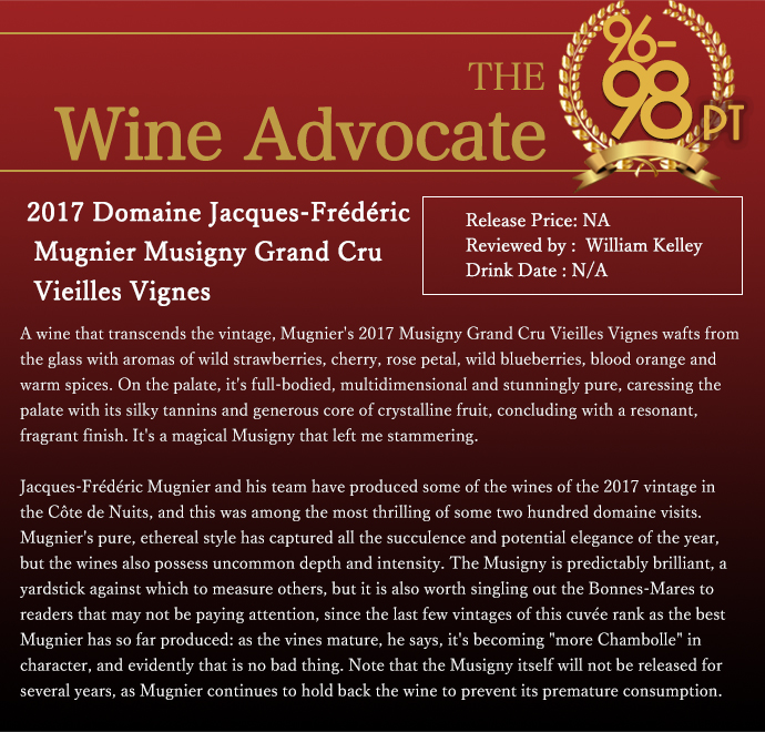 ワインアドヴォケイト誌驚異の96-98点!コメントは「ヴィンテージを超越したワイン、ミュニエの2017ミュジニー・グラン・クリュ・ヴィエイユ・ヴィーニュは、野イチゴ、チェリー、バラの花びら、野生のブルーベリー、ブラッドオレンジ、温かみのあるスパイスのアロマがグラスから漂う。口に含むと、フルボディで多次元的、そして驚くほどピュアで、絹のようなタンニンとクリスタルのような果実味のたっぷりとした核で口中を愛撫し、共鳴的で香り高いフィニッシュで締めくくる。魔法のようなミュジニーで、思わず口ごもった。」!