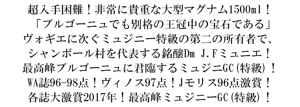 さらに今やパーカーを凌駕する勢いのアラン・メドゥのバーガウンド・ドット・コムでも94点!M.Wのジャスパー・モリスいわく「ミュジニーは私にとってブルゴーニュでも別格の王冠中の宝石でありシャンベルタンと同格にある。どちらが好きかと迫られたら、シャンベルタンを後に回す。おそらくヴォーヌ・ロマネの1、2の単独所有者だけを別としてすべてのグラン・クリュの最高位にある」と激賞(この2017年に驚異の96点)させた最高峰ブルゴーニュ赤ワイン!しかもドメーヌの蔵出し品で、日本市場でもまず入手困難な貴重な大型マグナムサイズ(1500ml)で、グレイトヴィンテージ[2017]年もので超・超・超限定入荷!