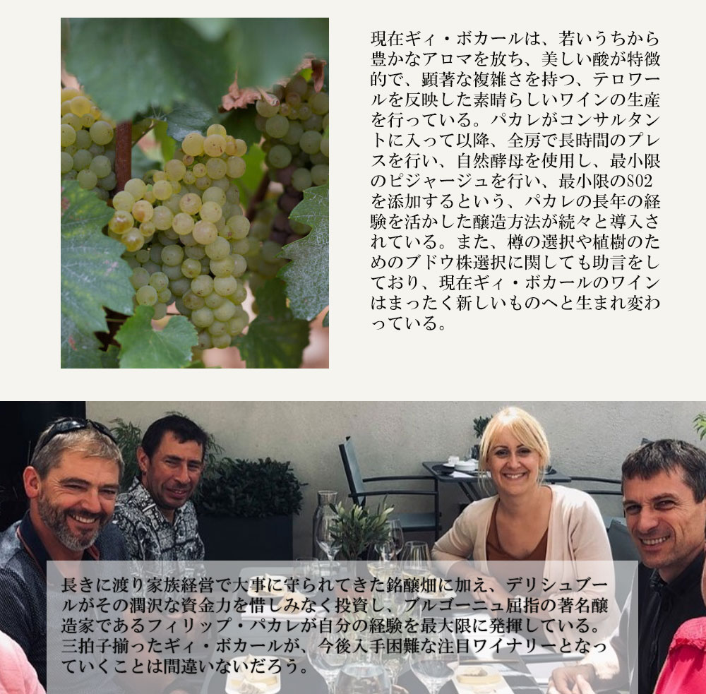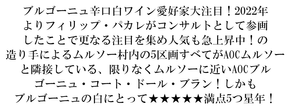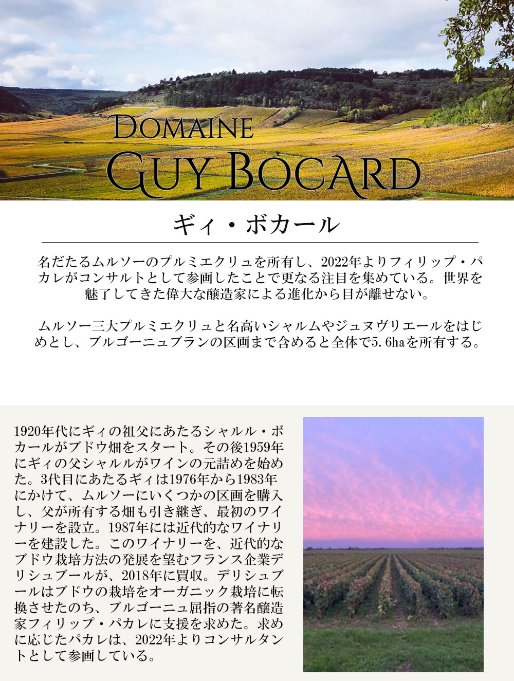 ブルゴーニュ辛口白ワイン愛好家大注目!ムルソー村内5つの区画のブレンドですべての区画がAOCムルソーと隣接している、限りなくムルソーに近いAOCブルゴーニュ・コート・ドール・ブラン!しかもブルゴーニュの白にとって★★★★★満点5つ星年!(RVF誌の2025年版ではブルゴーニュの白に98点を付けるスーパーグレイトヴィンテージ)の[2022]年もの!しかも名だたるムルソーのプルミエ・クリュを所有し、2022年よりフィリップ・パカレがコンサルトとして参画したことで更なる注目を集め人気も急上昇中!世界を魅了してきた偉大な醸造家による進化から今、目が離せません。しかもフランスワイン評価本“アシェット・ガイド誌”で“クープ・ド・クール”(ハートに一撃)常連の人気造り手!ミシェル・ベタンヌ・ドゥソーヴにも登場!Dussert-Gerber「Guide des Vins 」では、“1er Grands Vins Classes”に選出され、RVF誌の2025年版では掲載のムルソー5作品のすべてが92~97点の高評価を獲得!この偉大なヴィンテージのAOCブルゴーニュ ブラン・コート・ドール[2022]年で90点の高評価獲得!他8銘柄を掲載!ドメーヌ・ギィ・ボカールによる人気辛口AOCシャルドネ!しかもスーパーグレイトヴィンテージ[2002]年!しかもムルソーの畑に隣接する5つの区画からのシャルドネ100%!限りなくムルソーに近いAOCブル!!名だたるムルソーのプルミエクリュを所有し、2022年よりフィリップ・パカレがコンサルトとして参画したことで更なる注目を集めている。世界を魅了してきた偉大な醸造家による進化から目が離せない。 ムルソーコミューン内でAOCムルソーに近い1.82haの区画。シトラスの風味を感じるバランスの取れたフルボディ味わい。フィリップ・パカレのコンサルタントで造るシュール・リーの極意!深みとコクのある味わいと、みずみずしい軽やかさの両立!セクシーな円熟味たっぷりのまさにムルソーとも言える究極AOCブルゴーニュ ブラン・コート・ドール!が数ヶ月前の現地セラー蔵出し作品で限定少量入荷!
