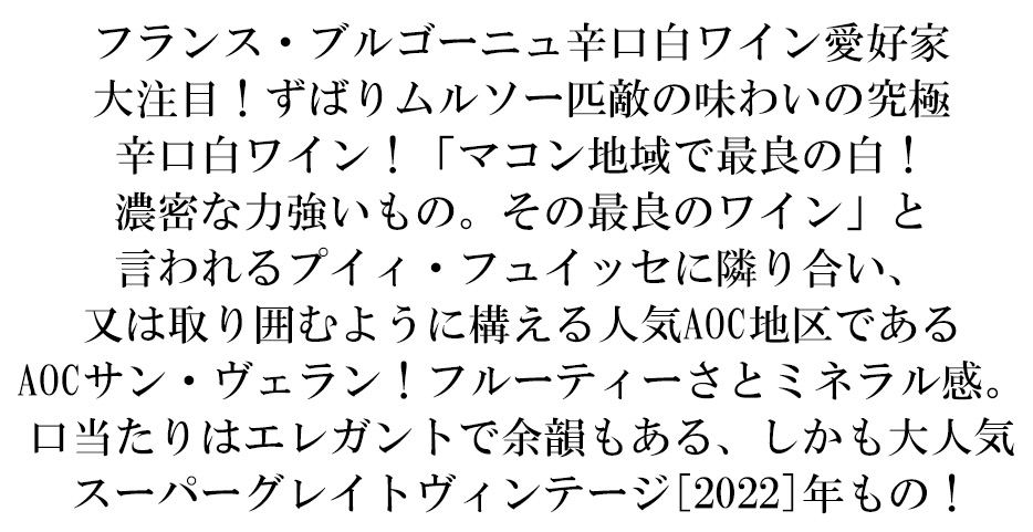 しかも「マコン地域で最良の白!濃密な力強いもの。その最良のワイン」と言われるプイィ・フュイッセに隣り合い、又は取り囲むように構える人気AOC地区であるAOCサン・ヴェラン!