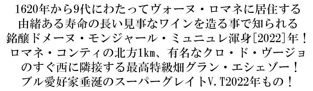 1.32haのパーセルからの平均樹齢40~68年のピノ・ノワールを手摘み100%!オーク樽(ヴァンサン氏自らトロンセの森の隣で切り拓いた上質のオーク材を18ヶ月乾燥して造ったこだわりオーク樽!)の新樽比率100%、ノンフィルターでリリースされる、グラン・エシェゾーならではの驚くほど凝縮された果実のアロマ!溢れる男性的でスパイシーでコクのある最高のフルボディ辛口赤ワイン!ドメーヌ・モンジャール・ミュニュレの究極グラン・エシェゾーの特級が、大人気スーパーグレイトヴィンテージ[2022]年もので限定少量入荷!