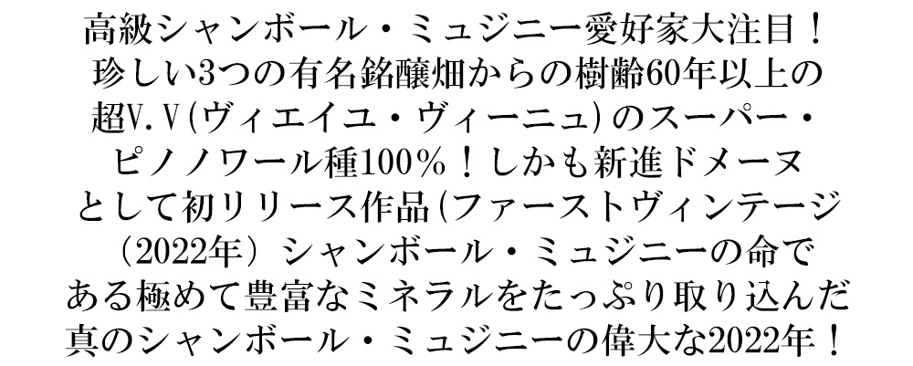 レースのように繊細な口当たりでコート・ド・ニュイで最も女性的な味わいと言われる究極シャンボール・ミュジニー!しかも珍しい樹齢60年以上の超V.V(ヴィエイユ・ヴィーニュ)のスーパー・ピノノワール種100%!