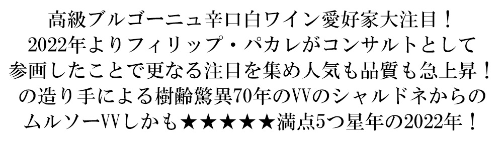 高級ブルゴーニュ辛口白ワイン愛好家大注目!完全割当て品!高級ムルソーVV愛好家垂涎!しかも待望のスーパーグレイトヴィンテージ[2022]年!しかもブルゴーニュの白にとって★★★★★満点5つ星年!(RVF誌の2025年版ではブルゴーニュの白に98点を付けるスーパーグレイトヴィンテージ)の[2022]年もの!しかも樹齢70年のVVのシャルドネ100%!しかも名だたるムルソーのプルミエ・クリュを所有し、2022年よりフィリップ・パカレがコンサルトとして参画したことで更なる注目を集め人気も品質も急上昇中!世界を魅了してきた偉大な醸造家による進化から今、目が離せません。リッチなテクスチャーで世界的に有名な白ワインの産地であり、高級白ワインのひとつ!コート・ドールの代表格でもあるムルソー!ブルゴーニュ最上の白ワインを産する村の中でも、もっともやわらかく芳醇で円熟している。ジャスパー・モリスM.W.は、「昔からムルソーの香りを“バターとヘーゼルナッツ(beurre et noisettes)”と表現し、フランスのソムリエ界でよく使う。(この2語は)セットになっており、片方の香りがわかるともう一方は自動的に見つかる。」と大注目!するムルソー!しかもフランスワイン評価本“アシェット・ガイド誌”で“クープ・ド・クール”(ハートに一撃)常連の人気造り手!ミシェル・ベタンヌ・ドゥソーヴにも登場!Dussert-Gerber「Guide des Vins 」では、“1er Grands Vins Classes”に選出され、RVF誌の2025年版では掲載のムルソー5作品のすべてが92~97点の高評価を獲得!この偉大なヴィンテージでリッチなテクスチャーで世界的に有名な白ワインの産地であり、高級白ワインのひとつ!コート・ドールの代表格でもあるムルソー!この偉大なヴィンテージのムルソー ヴィエイユ・ヴィーニュ[2022]年・蔵出し作品・ドメーヌ・ギィ・ボカール元詰でRVF誌2025年版で驚異の92点の高評価獲得!粘土石灰質 標高270m南東向きの畑、栽培はビオロジック栽培。農薬不使用。手摘みで収穫。樹齢驚異70年のVV オークの小樽で天然酵母だけで発酵させる。マロラクティック発酵あり。オーク樽で熟成の後、ろ過して瓶詰。新樽の使用10% ムルソーのDurots, Malpoiriers, Dressoles, En La Barre畑4区画のブレンド。コート・ドールのシャルドネよりも香りは熟していて少しスパイシー。深みがありながら余分な重さがない、実に魅力的なベンチマーク的なムルソー!!名だたるムルソーのプルミエクリュを所有し、2022年よりフィリップ・パカレがコンサルトとして参画したことで更なる注目を集めている。世界を魅了してきた偉大な醸造家による進化から目が離せない。セクシーな円熟味たっぷりのまさにムルソー ヴィエイユ・ヴィーニュ[2022]年!輝きのある黄金色、洋梨、リンゴ、アーモンドの香り。フルーティーでエレガントな印象。 バランスのとれたムルソーで、豊富な酸、新鮮なフルーツの香り、心地よい余韻と塩気のある余韻が特徴のムルソー ヴィエイユ・ヴィーニュ[2022]年が数ヶ月前の現地セラー蔵出し作品で限定少量入荷!(クリームソースを使った鶏、オマール海老、白身魚。高級中国料理等と相性抜群)